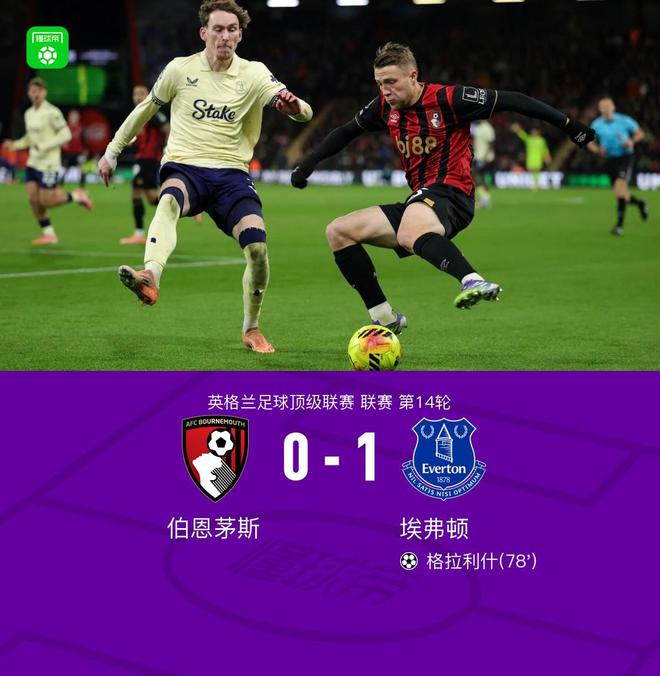 埃弗顿1-0客胜伯恩茅斯,格拉利什建功,克鲁皮破门被吹